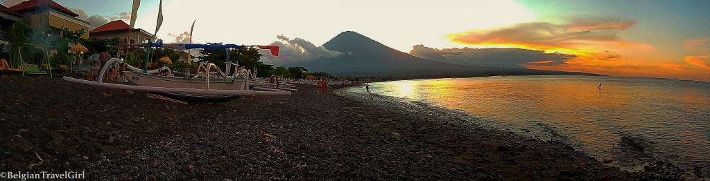 Après avoir discuté avec un français qui travaillait dans une école de plongée pas loin de là, j’ai changé d’avis car le prix était assez important : Comptez un budget de minimum 180 € par personne pour un baptême en piscine obligatoire et une journée de plongée dans l’épave. J’ai donc simplement décidé de repartir le lendemain après avoir profité du superbe coucher de soleil sur la plage de galets noirs d’Amed qui donne tout son charme à l’endroit.