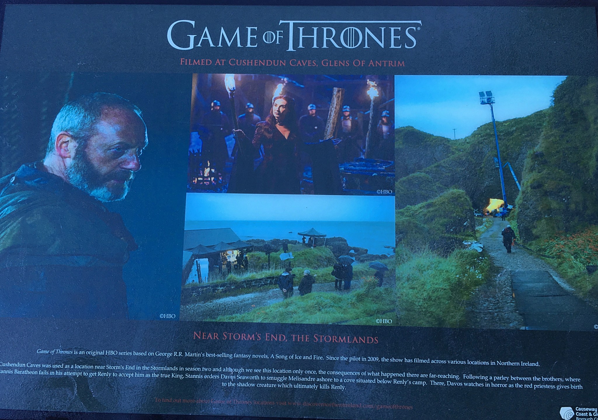La scène tournée ici se passe à la saison 2, quand Ser Davos fait entrer Mélisandre clandestinement dans une grotte proche du camp de Renly Barathéon, et c’est là que Mélisandre donne naissance à l’ombre.