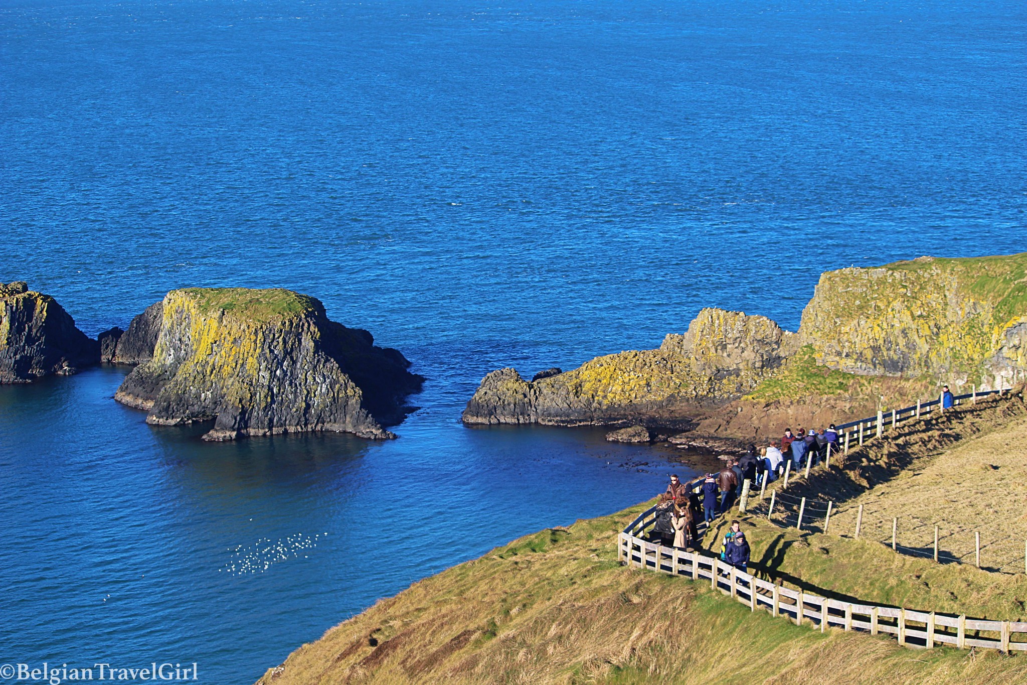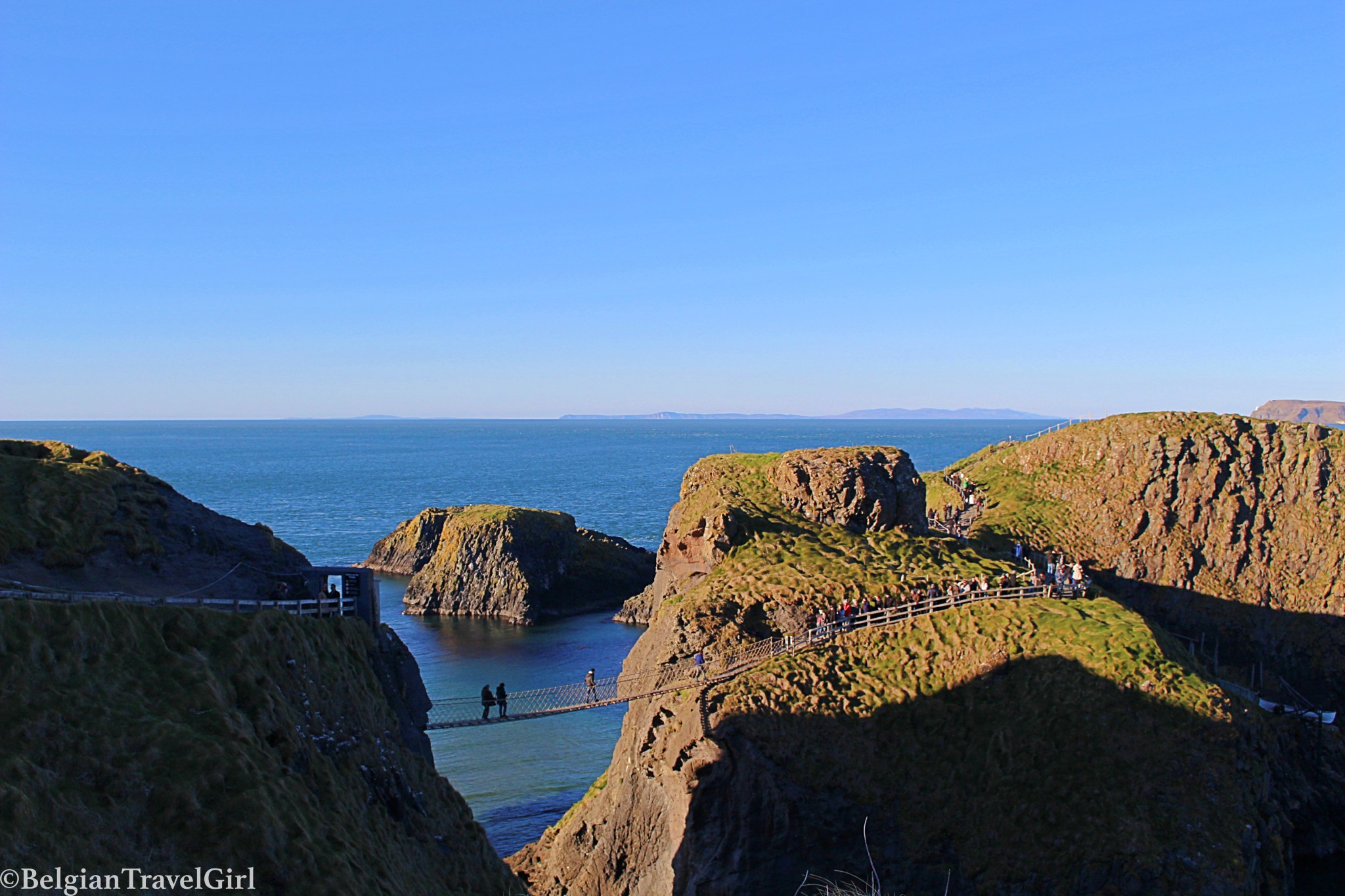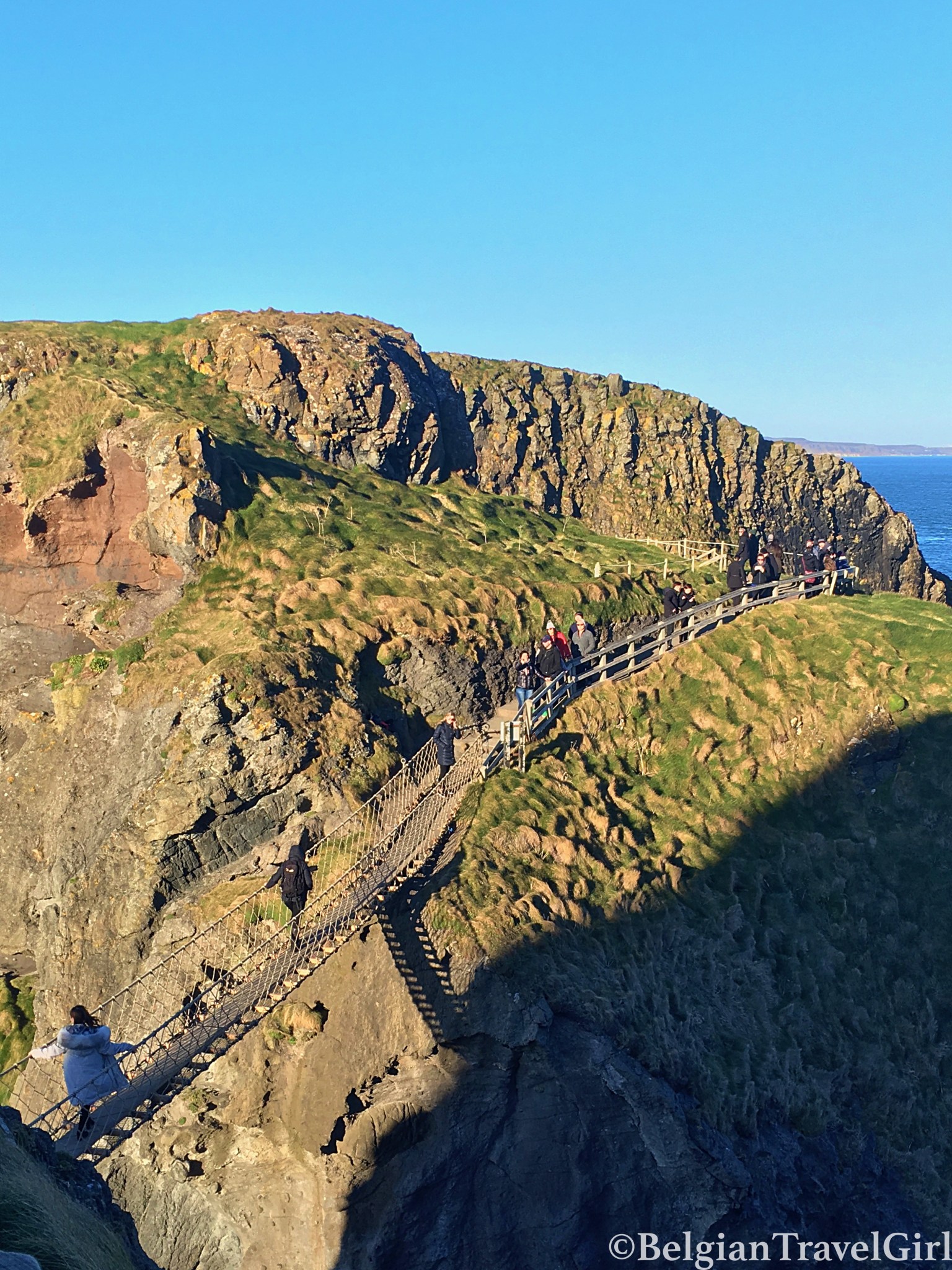 Avant de rentrer à l’auberge, je suis passée par un autre endroit magnifique (bah oui, désolée si le pays y est propice ! 😉 ) : le pont suspendu «Carrick-a-Rede» à Ballycastle. Il suffit de suivre le chemin en bordure de mer et vous pourrez traverser les 20 mètres qui séparent le continent de la péninsule de Carrick.