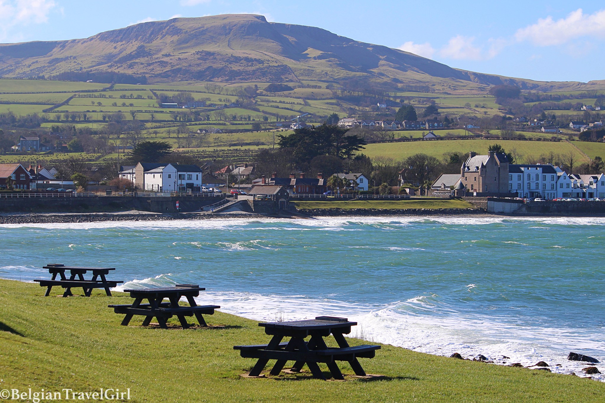 Premier arrêt, premier exemple : à seulement 20 min de Belfast, je suis sortie totalement par hasard de l’autoroute car les petits villages avaient l’air vraiment mignons et j’ai découvert le château de Carrickfergus et ses maisons avoisinantes 🙂