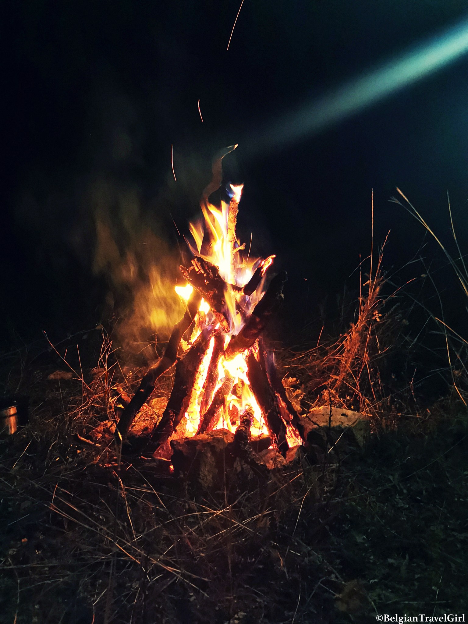 On monte la tente, on se fait à manger, on se fait un petit feu : Aucun bruit à part quelques oiseaux. Plus la soirée avance, plus on commence à stresser car il fait vraiment très calme. Ah oui, j’ai oublié de préciser qu’il y aurait des ours et des loups dans cette forêt 😅