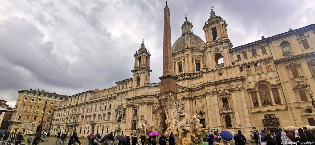 TROIS FONTAINES SONT INSTALLÉES DEVANT L’ENTRÉE DE L’ÉGLISE SAINTE-AGNÈS-EN-AGONE. LA FONTAINE LA PLUS IMPOSANTE EST LA FONTANA DEI QUATTRO FIUMI, AVEC SON OBÉLISQUE, DONT LES 4 PERSONNAGES DISPOSÉS AUTOUR SYMBOLISENT LES QUATRE CONTINENTS CONNUS À L’ÉPOQUE.