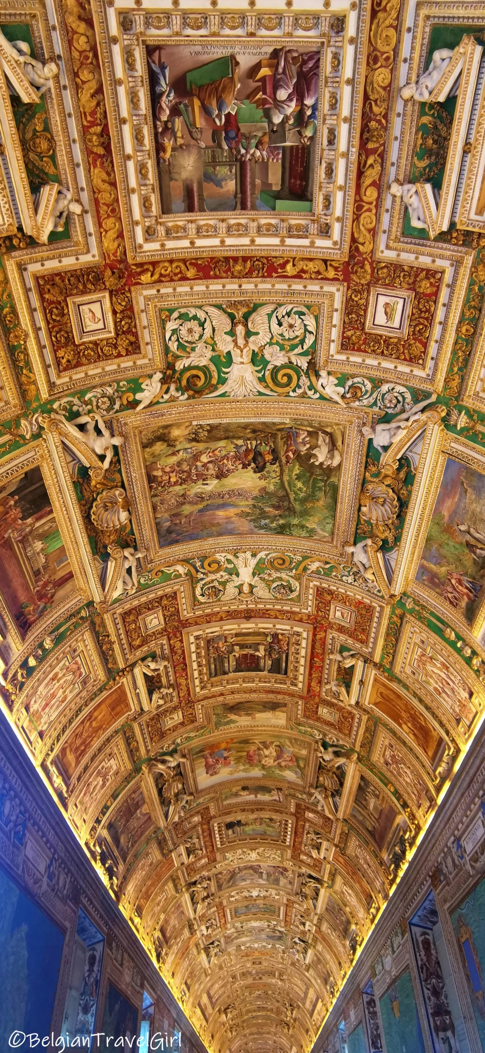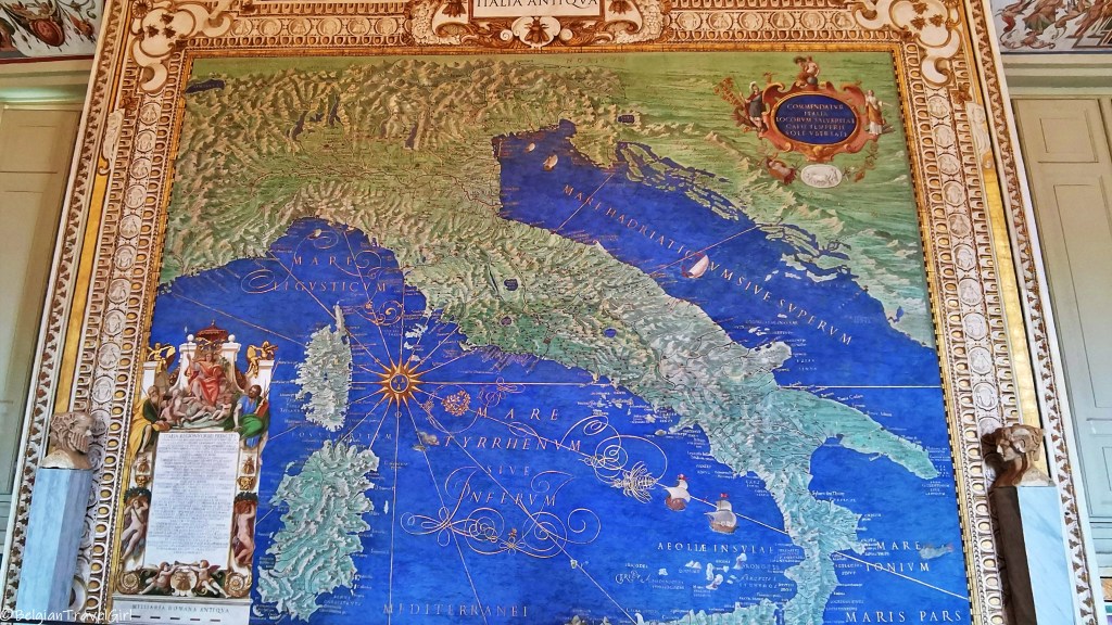Il est presque impossible de visiter chaque recoin des musées en une journée. Je ne vous cache pas que le plan reçu à l’entrée m’a été indispensable pour me repérer dans cette immense labyrinthe 🙂 Une des pièces que j’ai préférée est la « Galerie des Cartes », longue de 120 mètres avec un magnifique plafond vouté peint, qui présente 40 cartes topographiques du XVIe siècle.