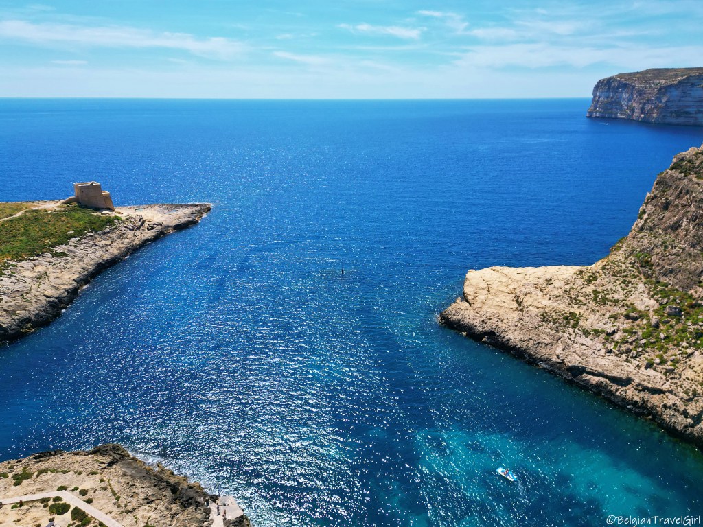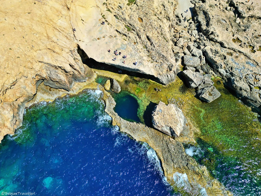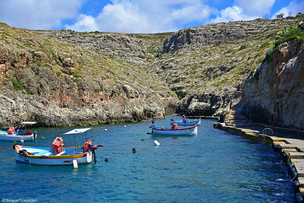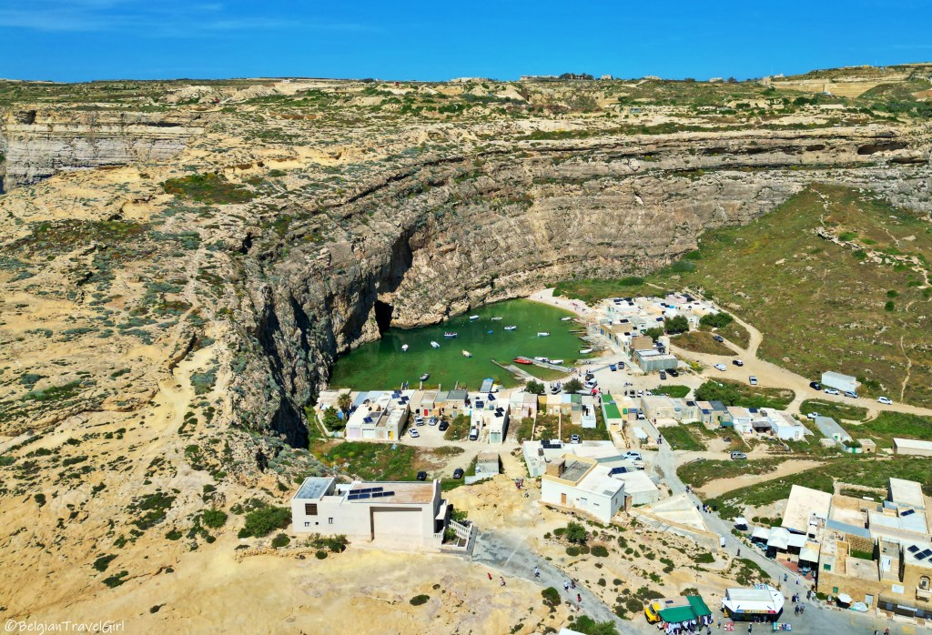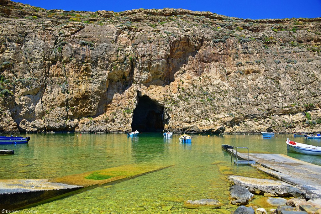 De retour sur Gozo, nous avons traversé l’île jusqu’au nord pour y voir un tout petit bout de mer à l’intérieur des terres. On dirait un magnifique petit lac qui est en fait relié à la mer par un tunnel qui mesure environ une centaine de mètres et passe sous la falaise.