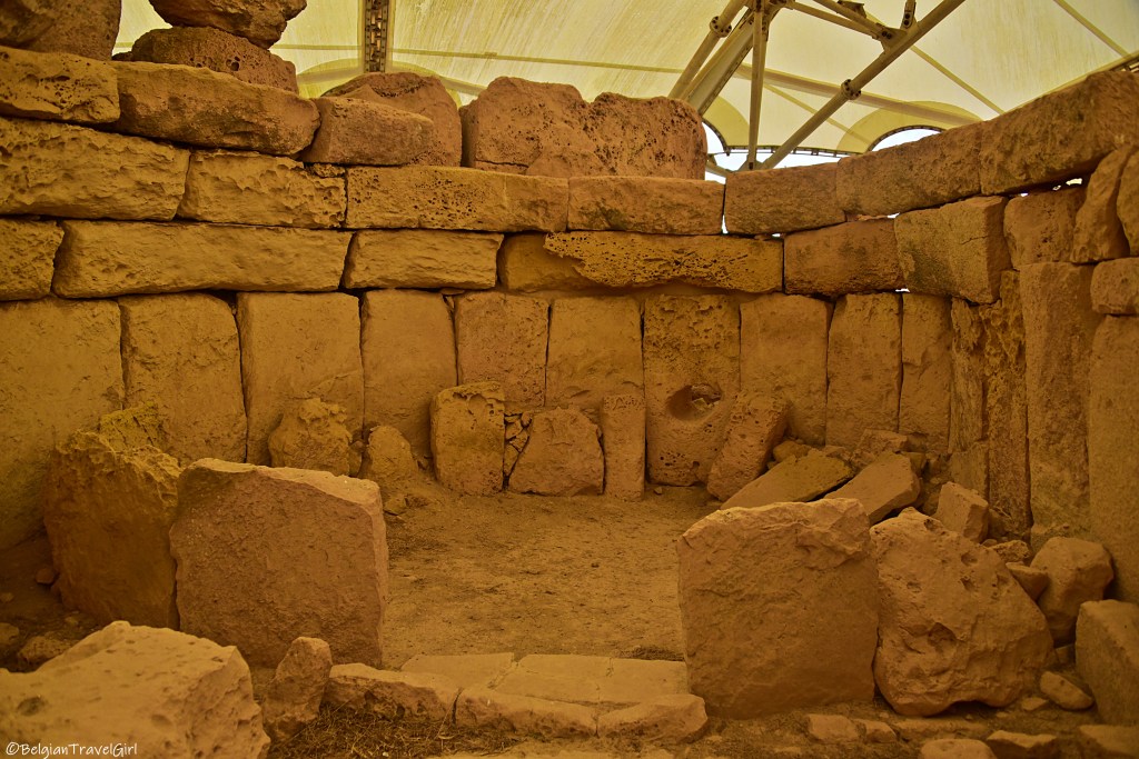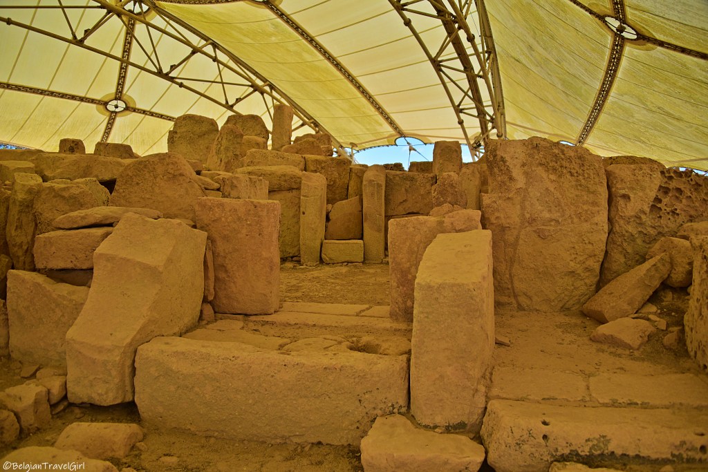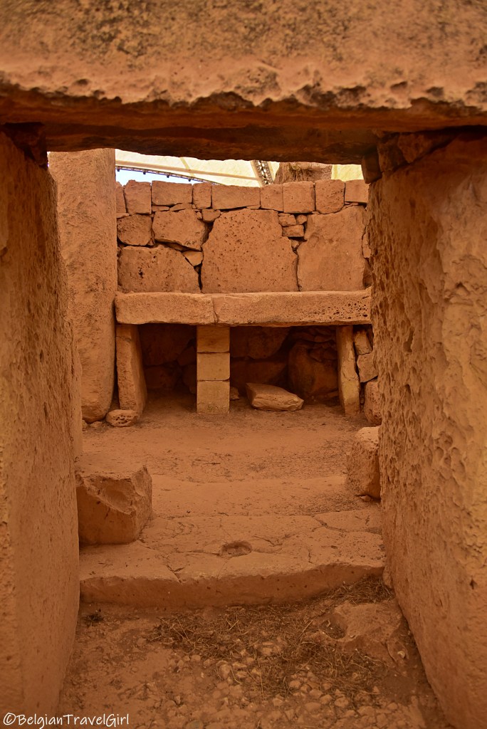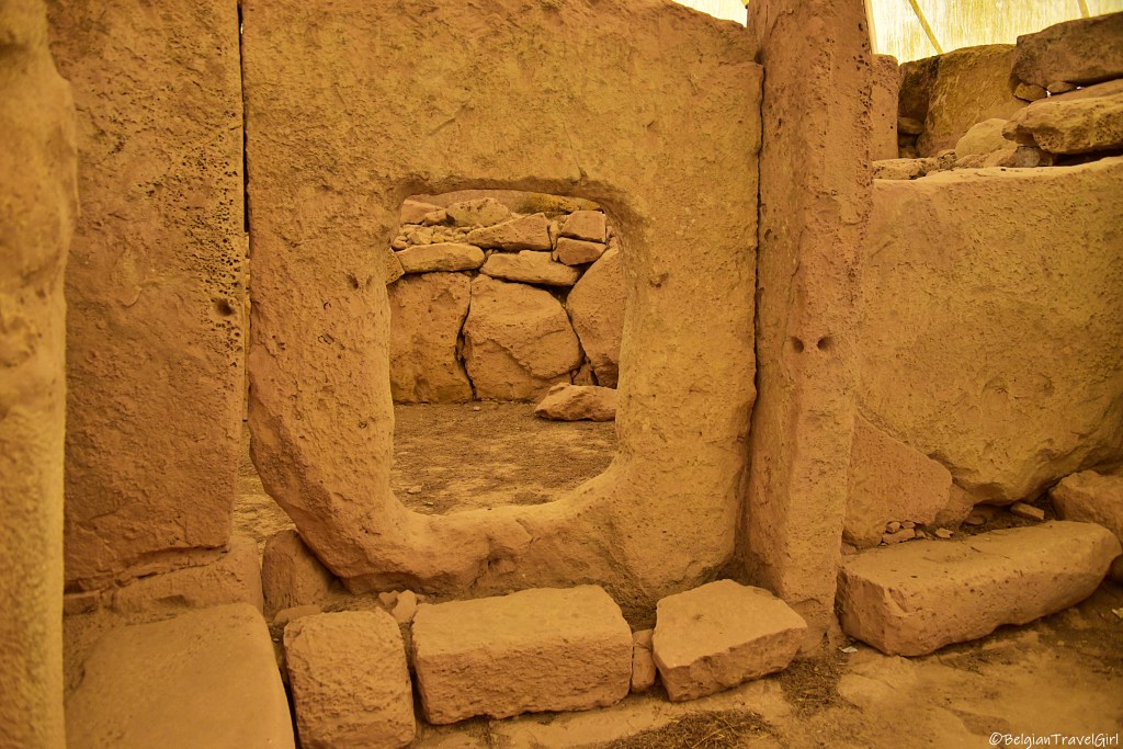 Le premier temple néolitique aux blocs de calcaire qu’on peut découvrir est Ħaġar Qim (prononcer Hadjar Im). Il a été construit et orienté à ce que les rayons du soleil viennent frapper le mur du fond aux équinoxes de printemps et d’automne, et illuminent les côtés de la porte aux solstices d’été et d’hiver. C’est du coup comme ça qu’ils se repéraient dans les saisons 😊