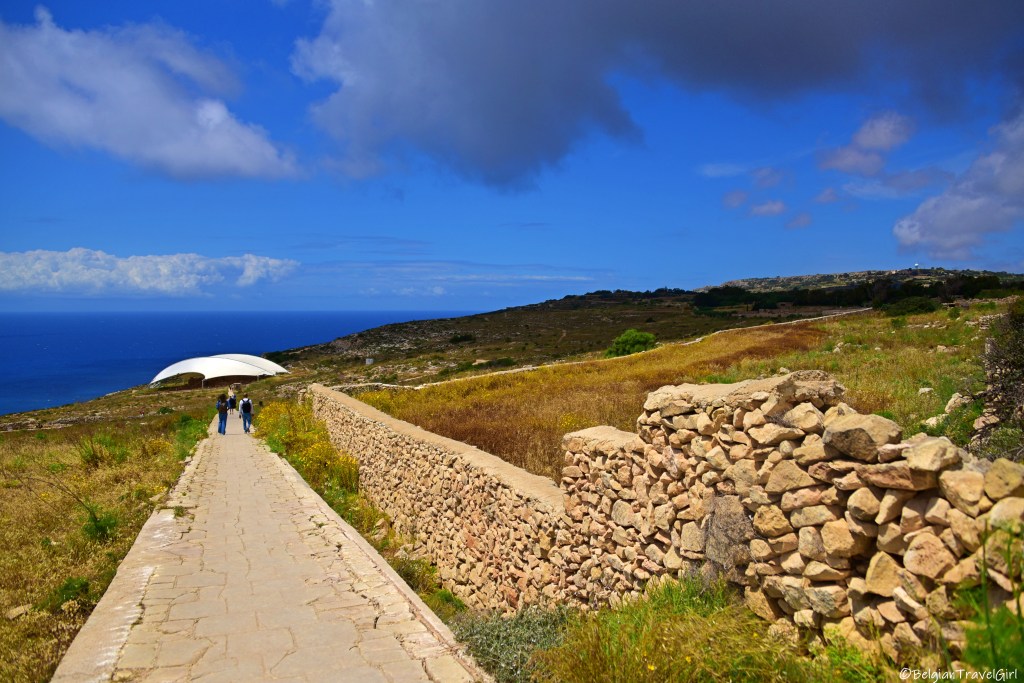 Le deuxième temple (Mnajdra) se trouve 500 mètres plus loin. Il vous suffit de suivre les pavés et de profiter de la vue sur l’île de Filfla. Celui-ci est un peu mieux conservé. Aujourd’hui, tout le site est protégé par des toiles gigantesques, car il est fortement exposé aux intempéries.