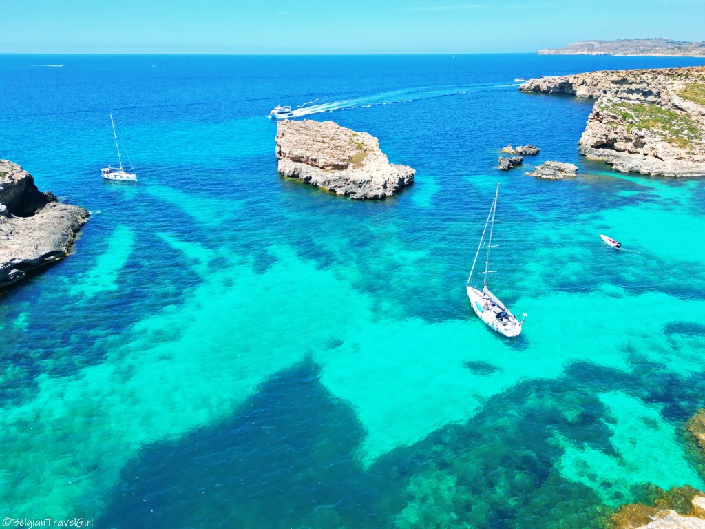 Cette dernière option nous a parue la plus adéquate étant donné que nous ne comptions y passer que quelques heures.. et vous comprendrez pourquoi ! Il suffit donc de vous rendre à Hondoq Bay d’où vous pourrez déjà admirer Comino et attendre un petit fast boat (une à deux traversées par heure en été) qui vous emmènera au Blue Lagoon en moins de temps qu’il ne faut pour le dire 😀