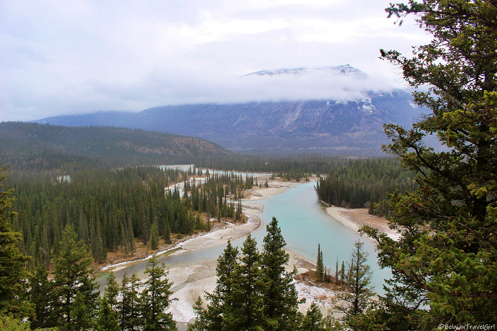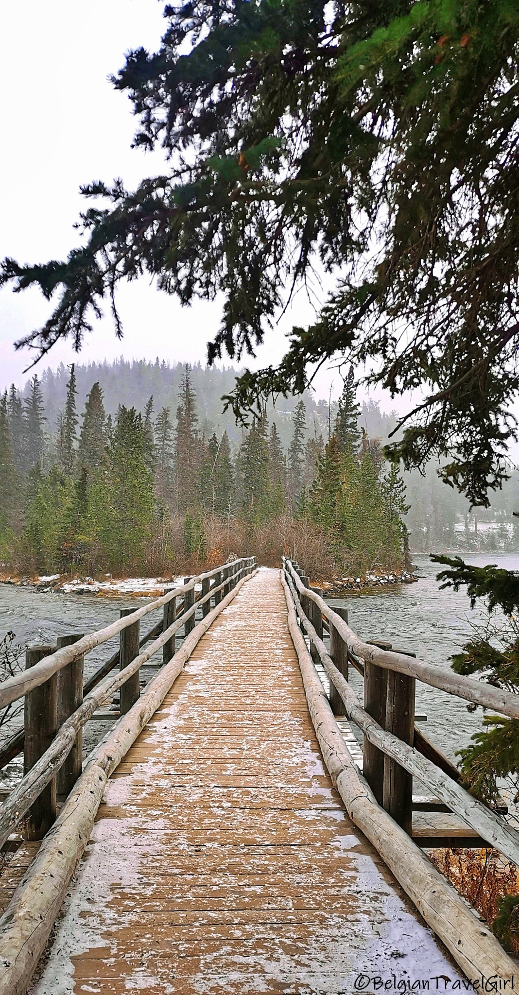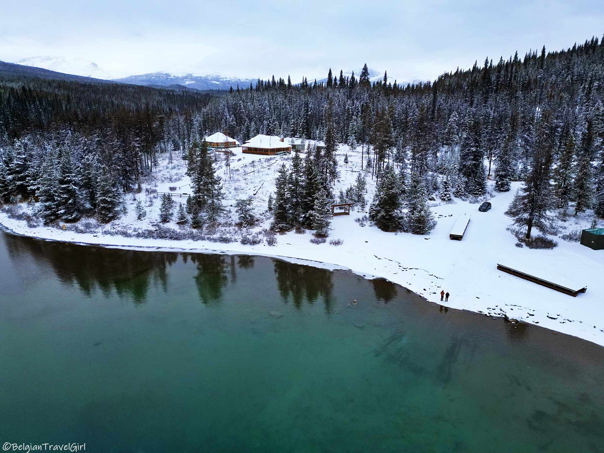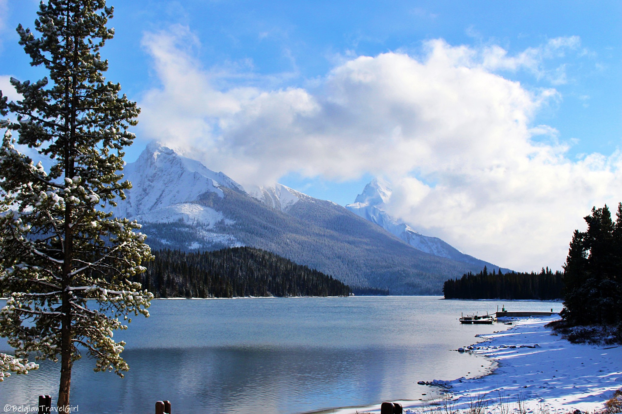 Le beau « Pyramid Lake » situé à 5-10min en voiture de Jasper est dominé par une majestueuse montagne en forme de pyramide, d’où son nom 🙂 Une petite île y est aménagée au milieu, c’est là en été que vous pourrez louer des kayaks. Nous n’avons malheureusement pas eu de chance de voir grand-chose car une tempête de neige s’est abbatue sur nous au même moment !