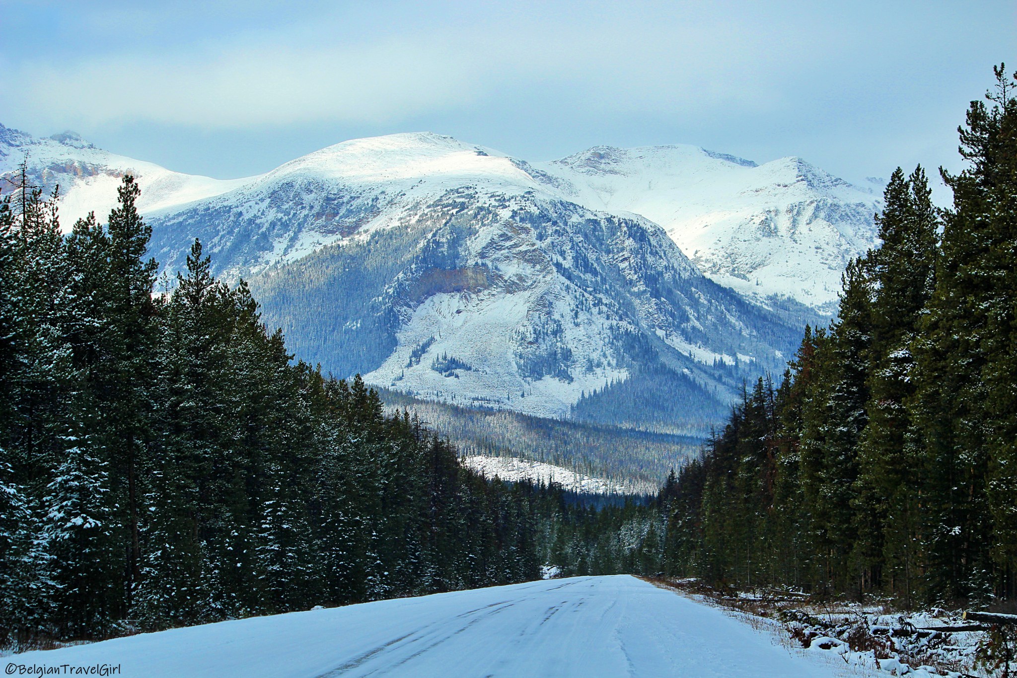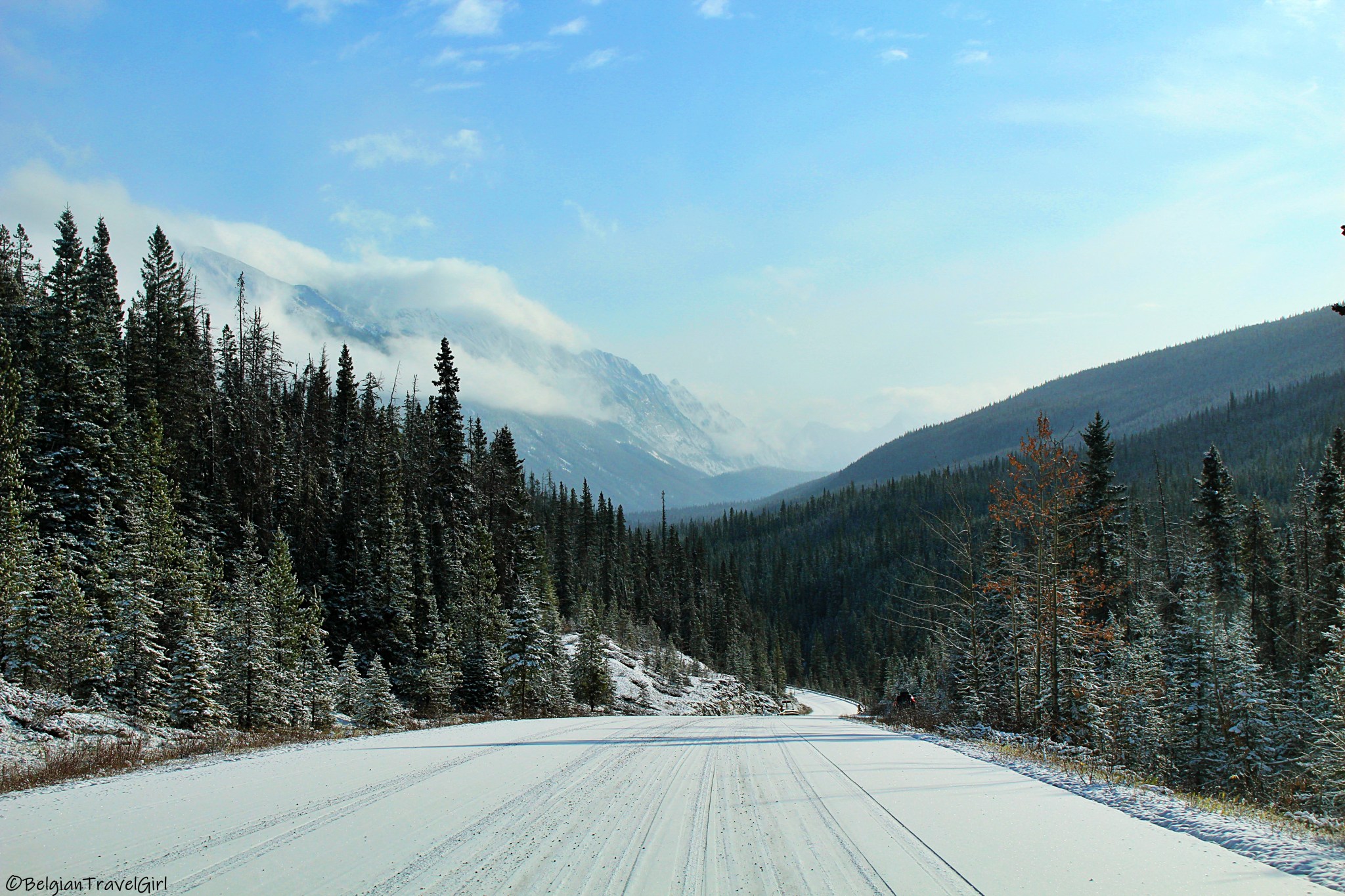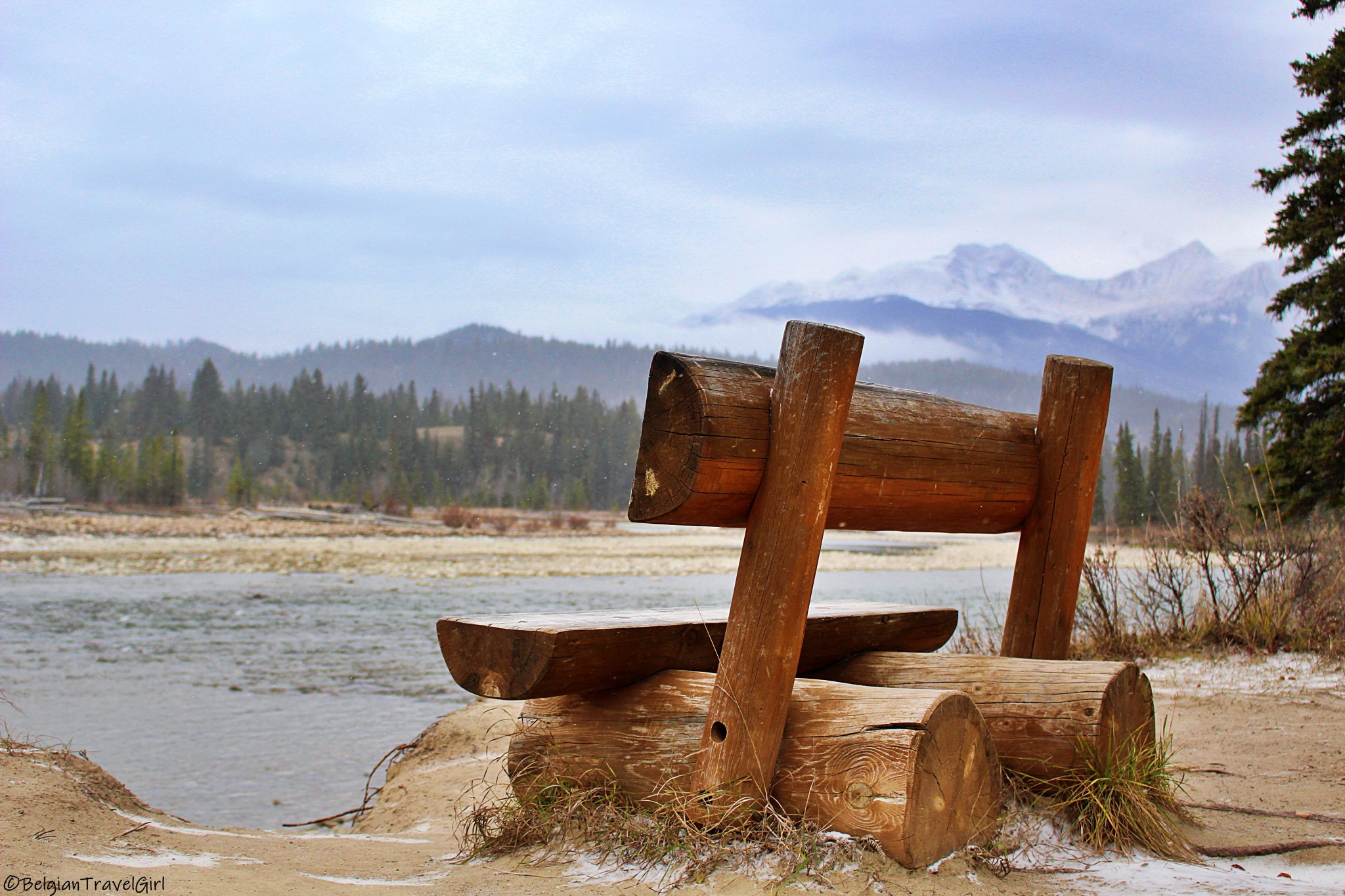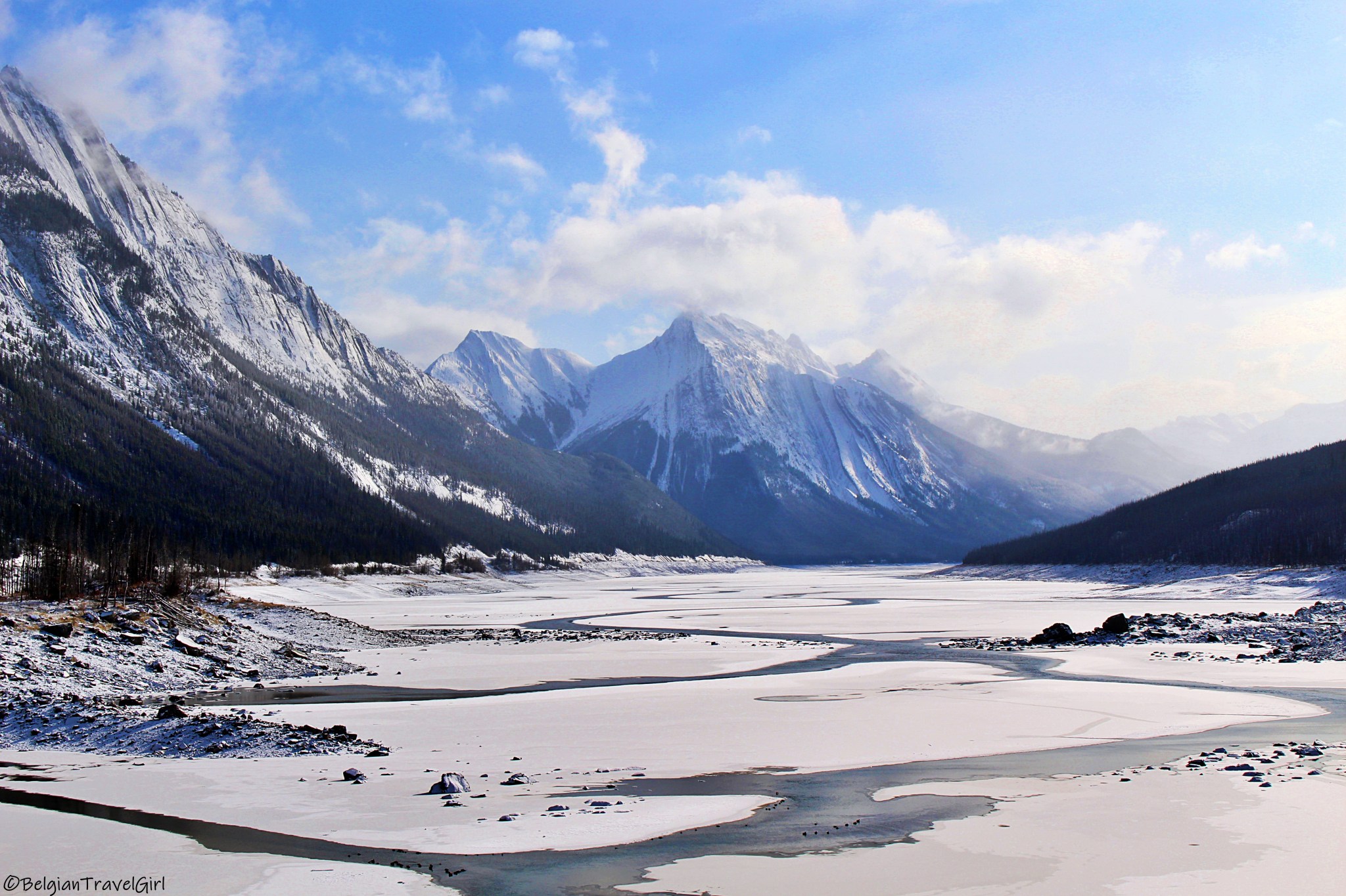 Le beau « Pyramid Lake » situé à 5-10min en voiture de Jasper est dominé par une majestueuse montagne en forme de pyramide, d’où son nom 🙂 Une petite île y est aménagée au milieu, c’est là en été que vous pourrez louer des kayaks. Nous n’avons malheureusement pas eu de chance de voir grand-chose car une tempête de neige s’est abbatue sur nous au même moment !