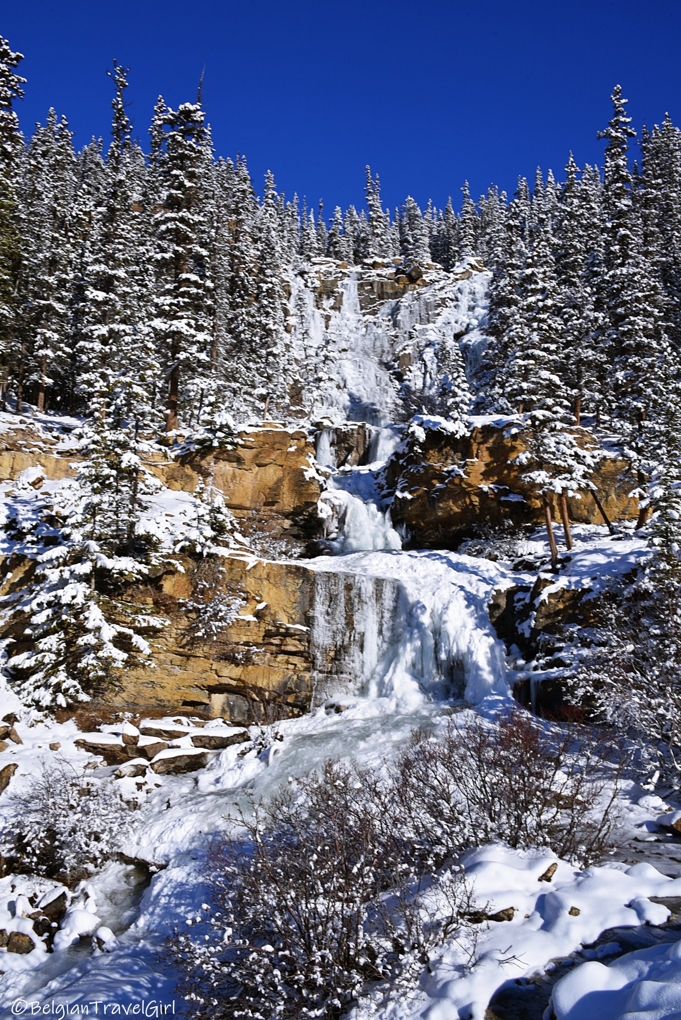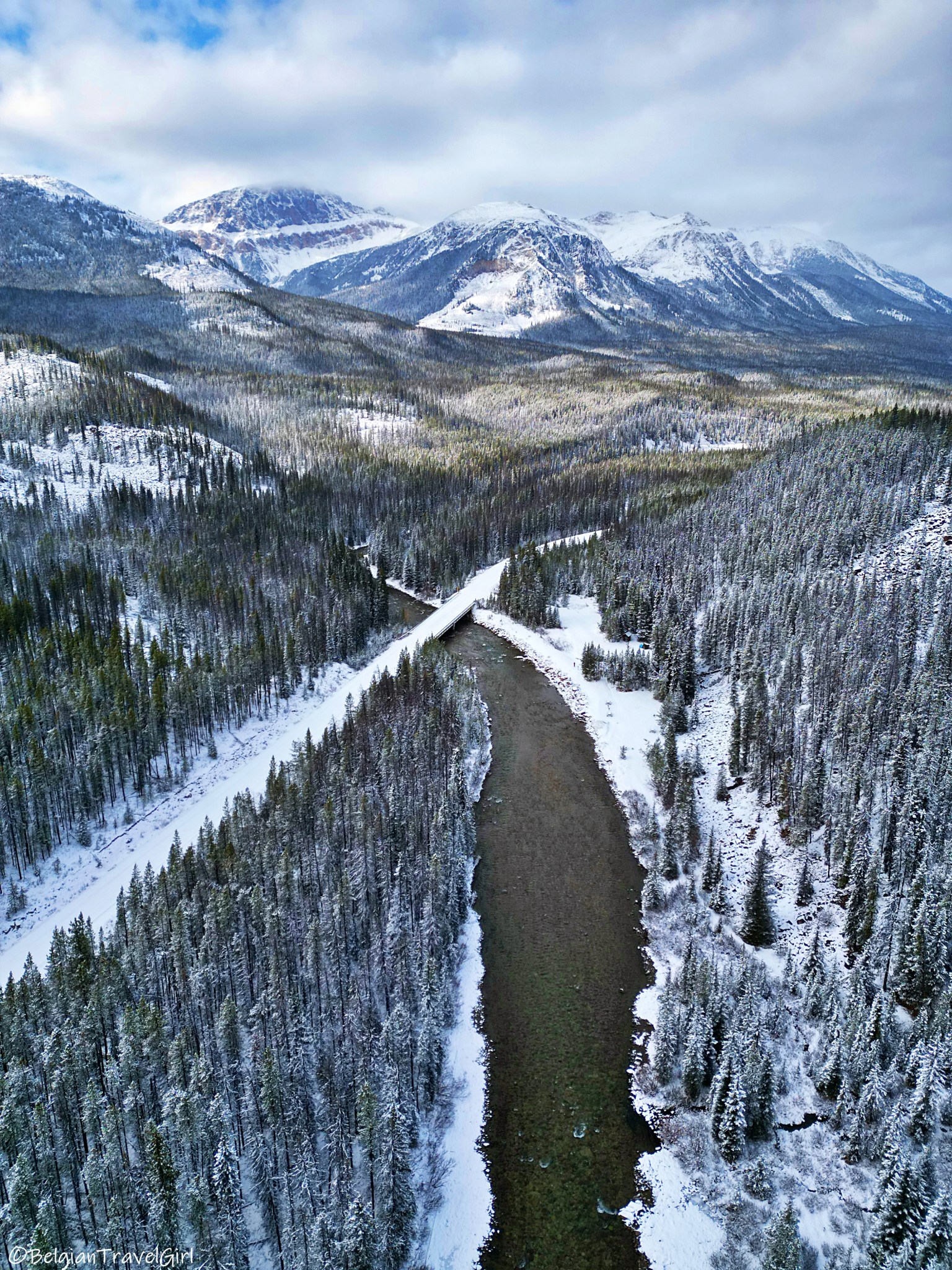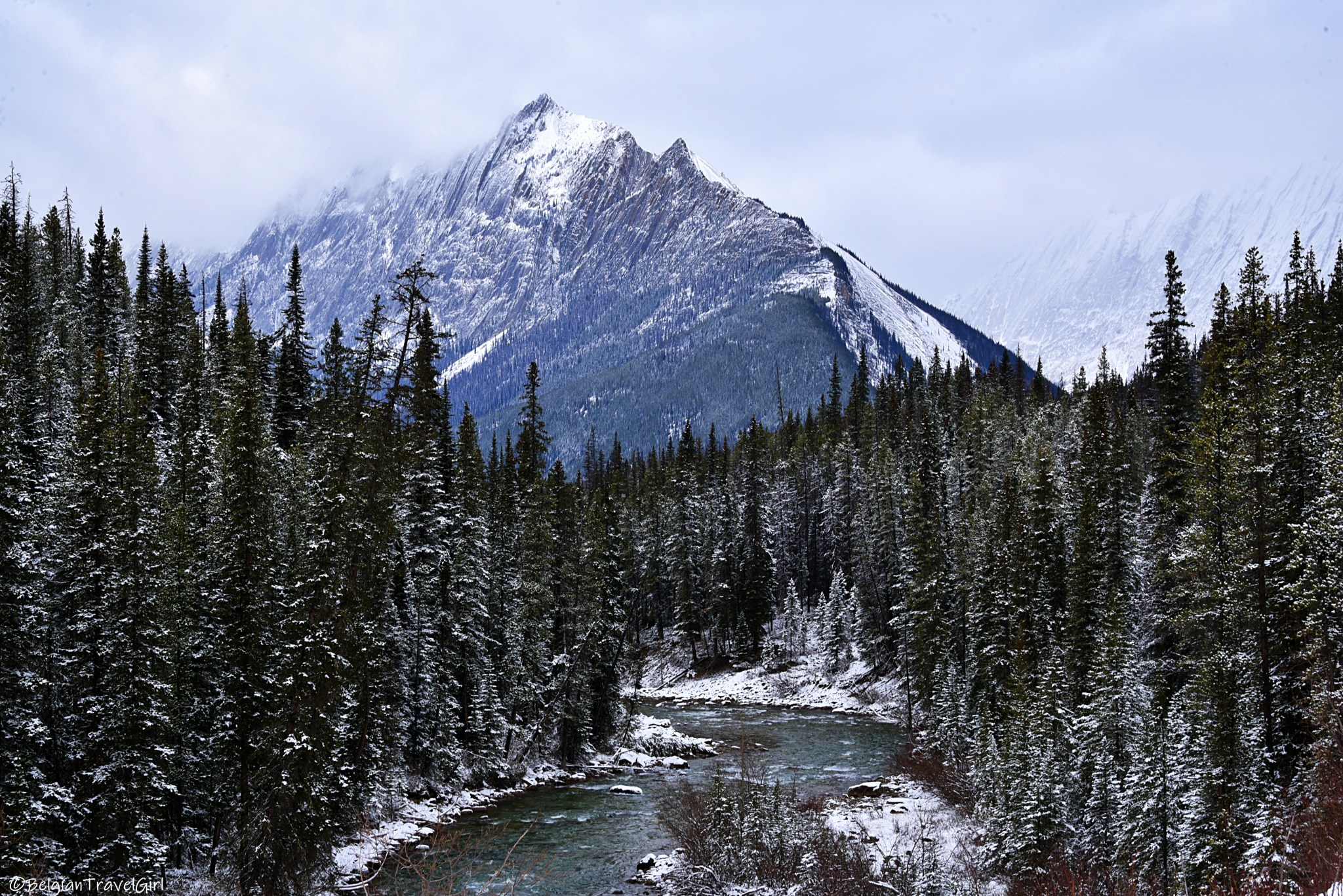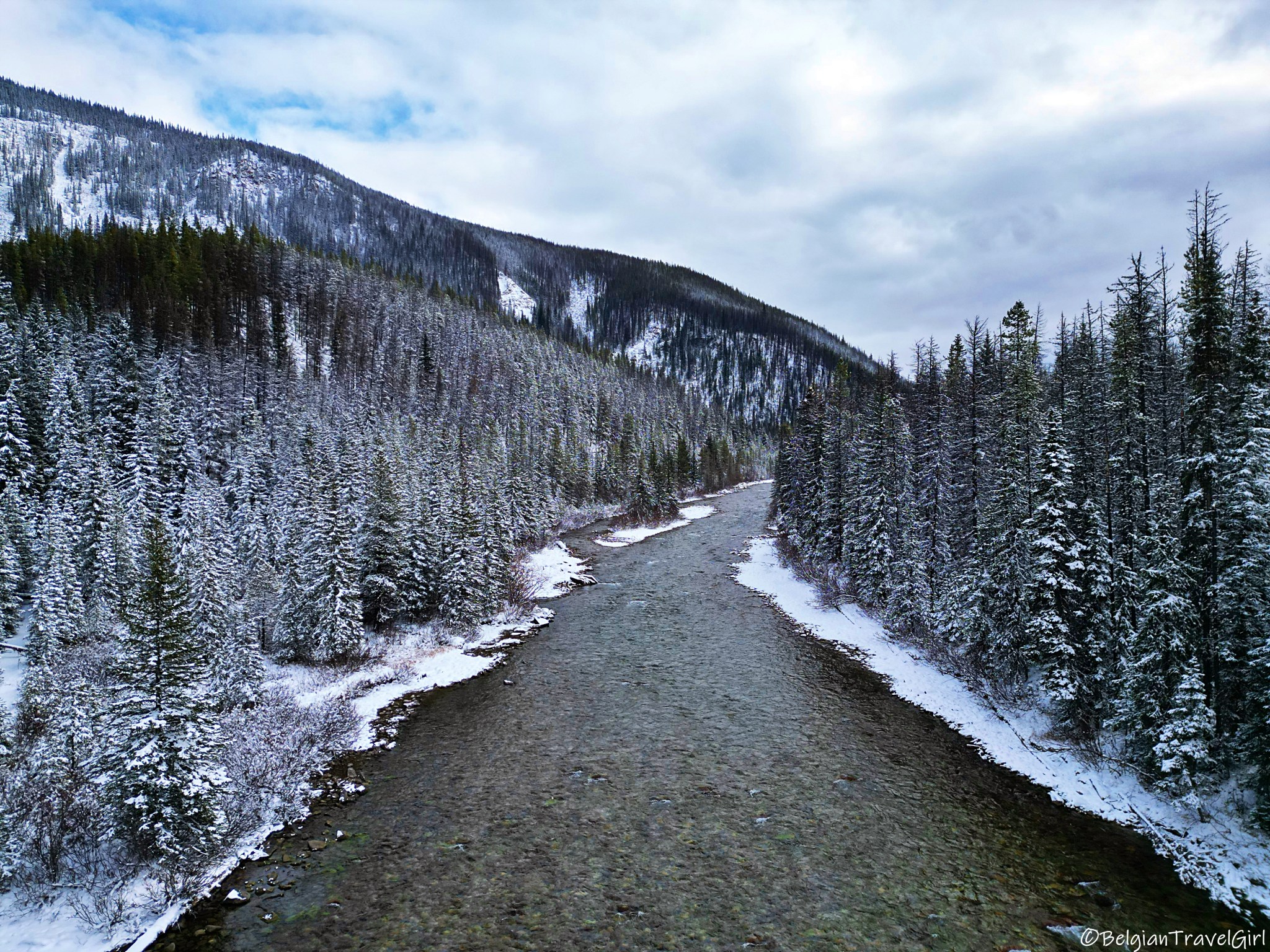 Le beau « Pyramid Lake » situé à 5-10min en voiture de Jasper est dominé par une majestueuse montagne en forme de pyramide, d’où son nom 🙂 Une petite île y est aménagée au milieu, c’est là en été que vous pourrez louer des kayaks. Nous n’avons malheureusement pas eu de chance de voir grand-chose car une tempête de neige s’est abbatue sur nous au même moment !