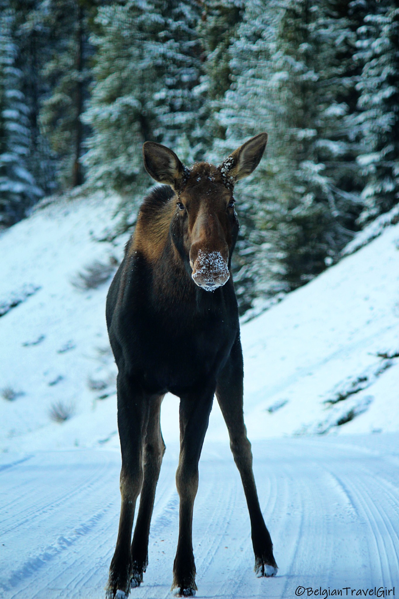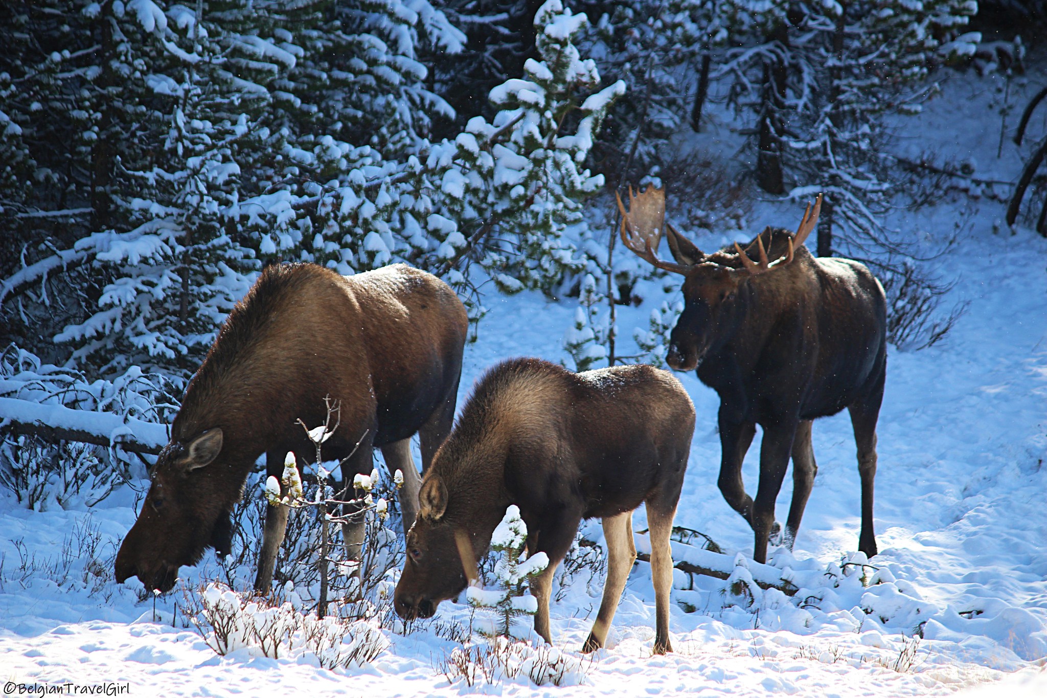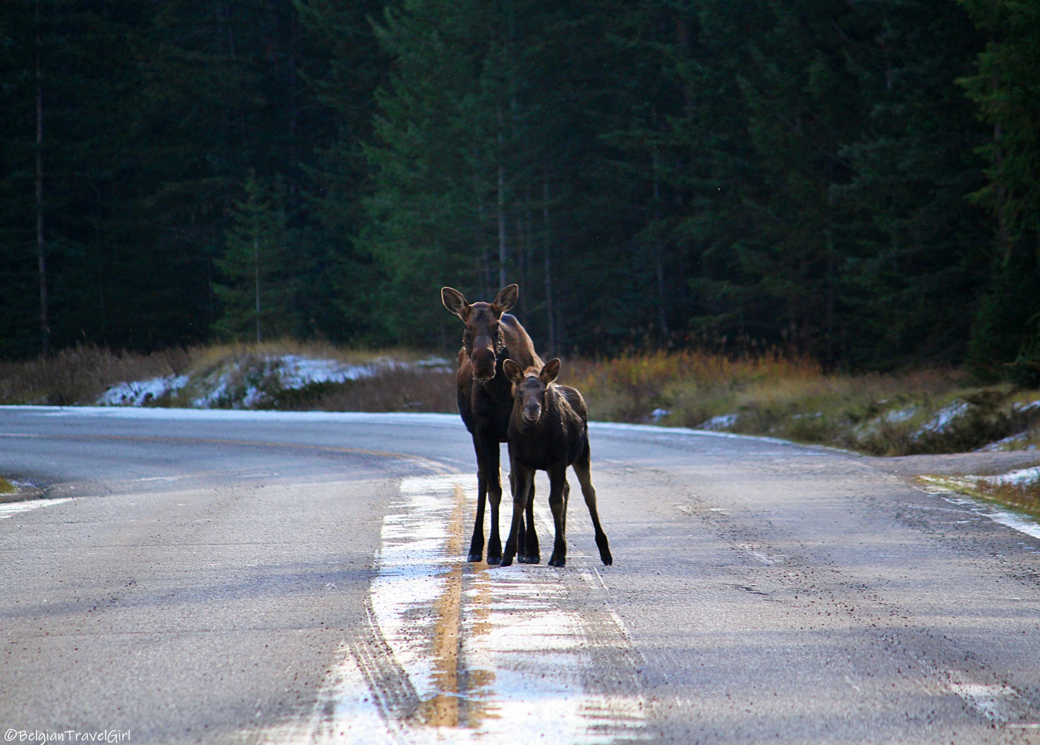 Maligne Lake Road : Notre deuxième journée au Jasper National Park s’est déroulée autour de la Maligne Lake Road pour atteindre le fameux Maligne Lake, à 50 min de route de Jasper. A peine arrivés dans le secteur qu’on a aperçu un orignal et son petit.