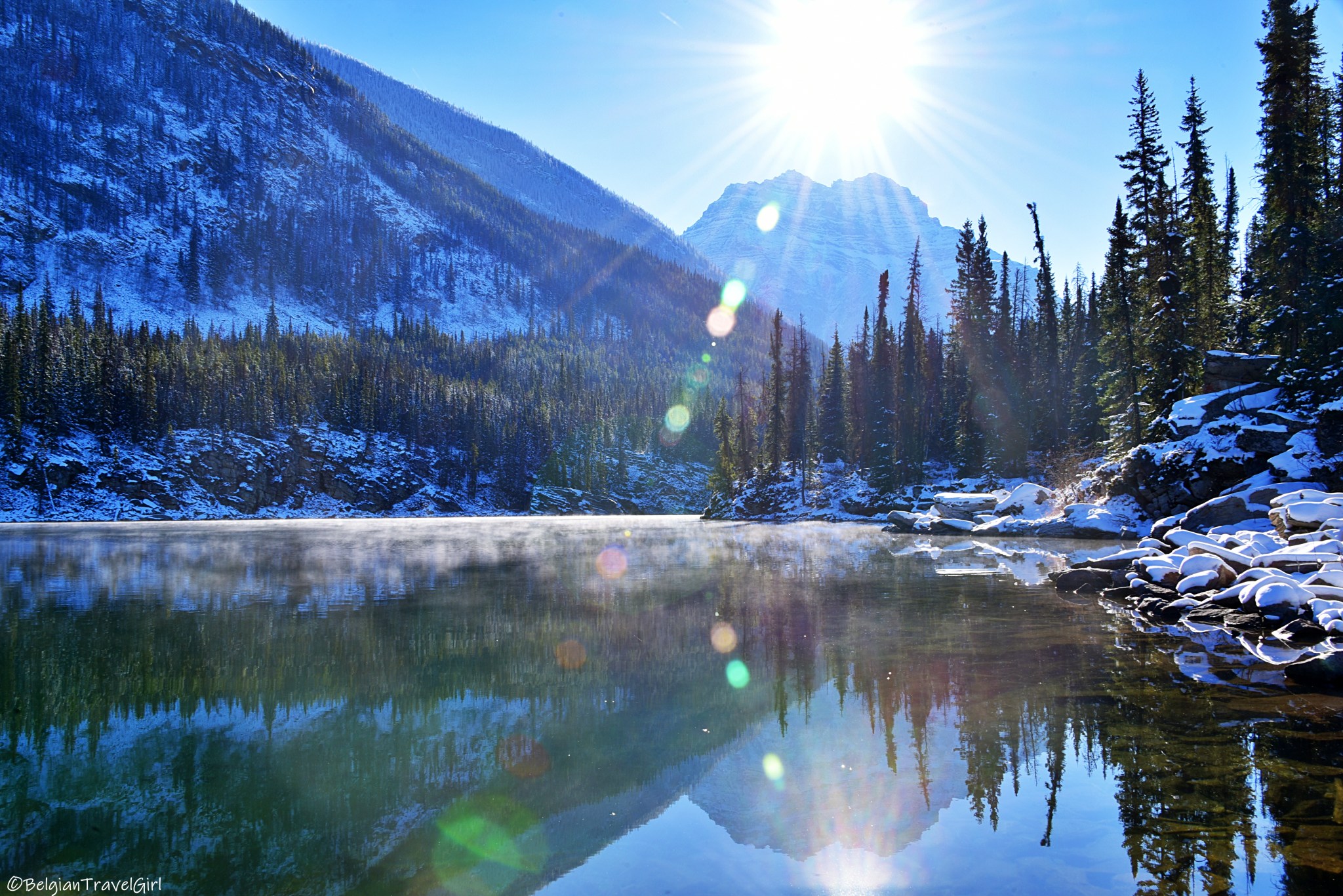 Le Horseshoe Lake se situe en fait sur la Highway 93 (la Promenade des Glaciers), mais dans le Parc National de Jasper. C’est sur la route du retour vers Calgary que nous avons fait un petit arrêt pour le voir 🙂 Le matin, la lumière est tout simplement incroyable. Attention car le parking est tout petit.